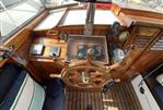 She has a very safe, comfortable deep centre cockpit! The ketch rig sail plan is very versatile, whether costal cruising or sailing blue water, she’s easy to handle, whatever the weather throws at you! We often sail under jib and jigger (genoa and mizzen), with her bespoke boom crutch a very sturdy and brilliant addition, which makes dropping the main sail in a blow (our go to squall plan) a doddle! Her ships wheel is from the 1943 RAF rescue launch ‘Jaymac’ and sits very well in her cockpit!. This cockpit is also a great entertaining space.