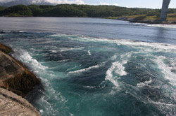 The world record for a current in the sea is held by the Saltstraumen near Bodø, in Norway. As the tide in the Skerstadfjord ebbs and flows, the water has to squeeze through a channel about 150 metres wide. Up to 400 million tonnes forces its way through the channel every six hours. The average top speed of the water is 7-9 knots, with peak flow estimated at 20 knots. When the current is strong large whirlpools are generated which can be 10 to 15 metres across.